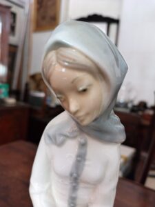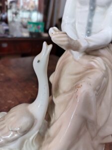 Figura de porcelana española simil LLadro. Niña con ganso. Art. # 2778 Ver también: Botellones o perfumeros de vidrio facetado Art Deco con gollete de plata Botellón de cristal tallado Pequeños bols de loza inglesa Par de potiches orientales << volver al listado